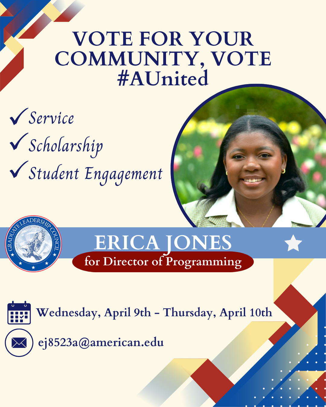 To my friends, classmates, and colleagues, my name is Erica Jones, and I am happy to announce that I am running for Director of Programming and Events of the American University Graduate Leadership Council.