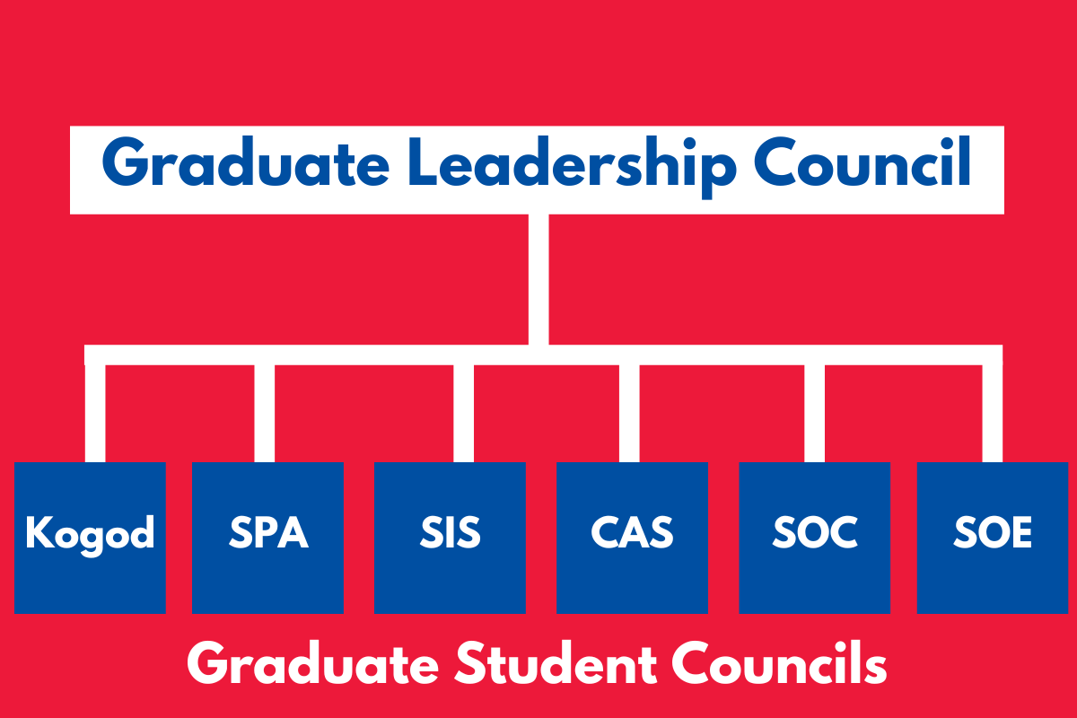 The Graduate Leadership Council (GLC) represents ALL graduate students at American University. In this capacity, the GLC is the ultimate authority for all graduate student advocacy matters. Additionally, the GLC holds and disburses graduate student activity fee dollars.